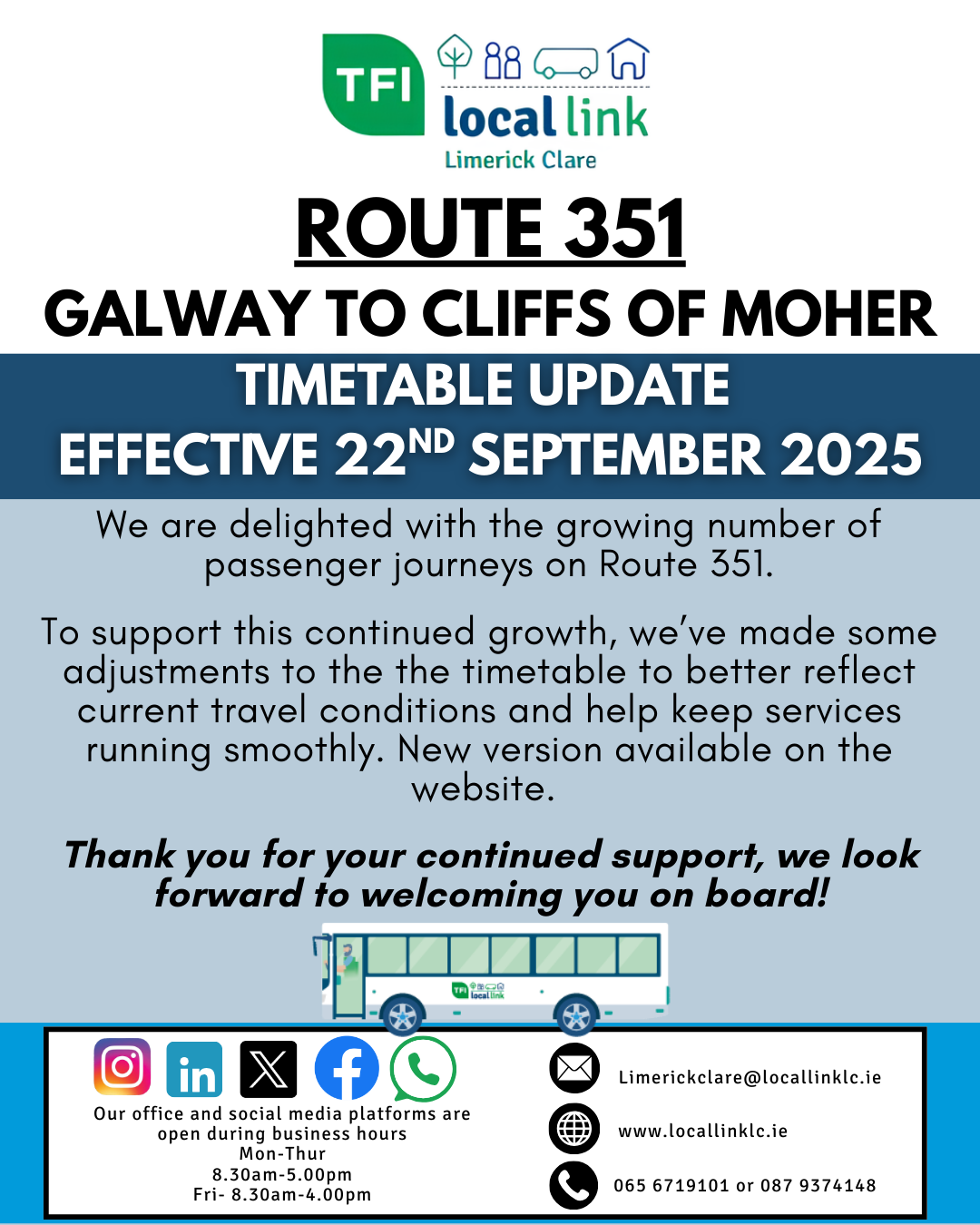 351 – Galway to Cliffs of Moher – Timetable Update Effective 22nd September 2025