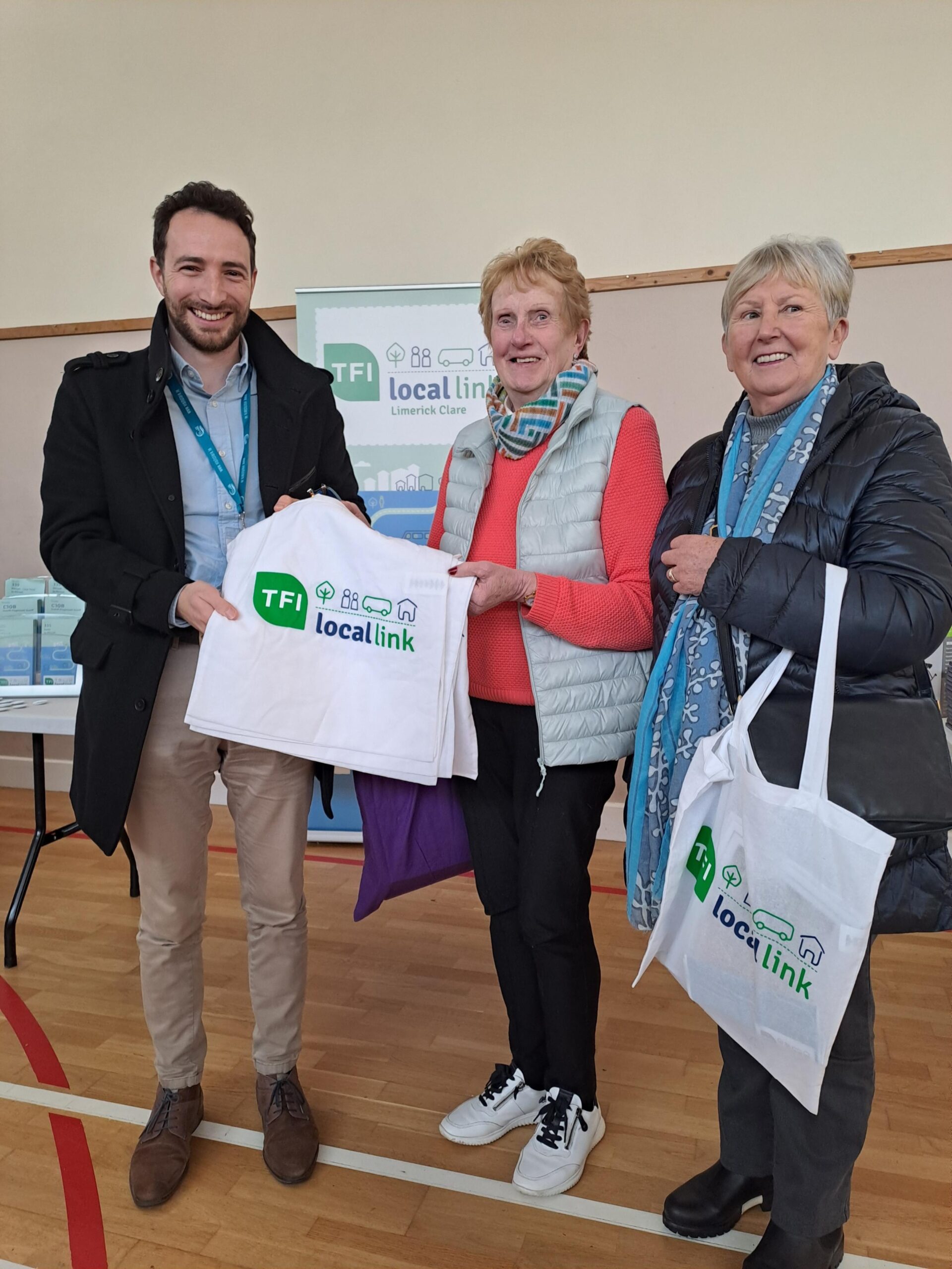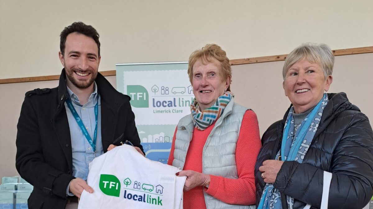 Pictured are Cillian from TFI Local Link Limerick Clare and Rena & Margaret from the local community. Great interest in our home pick up’s on our demand responsive services.
