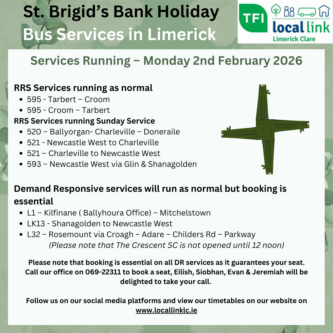 Follow us on our social media platforms and view our timetables on our website on www.locallinklc.ie