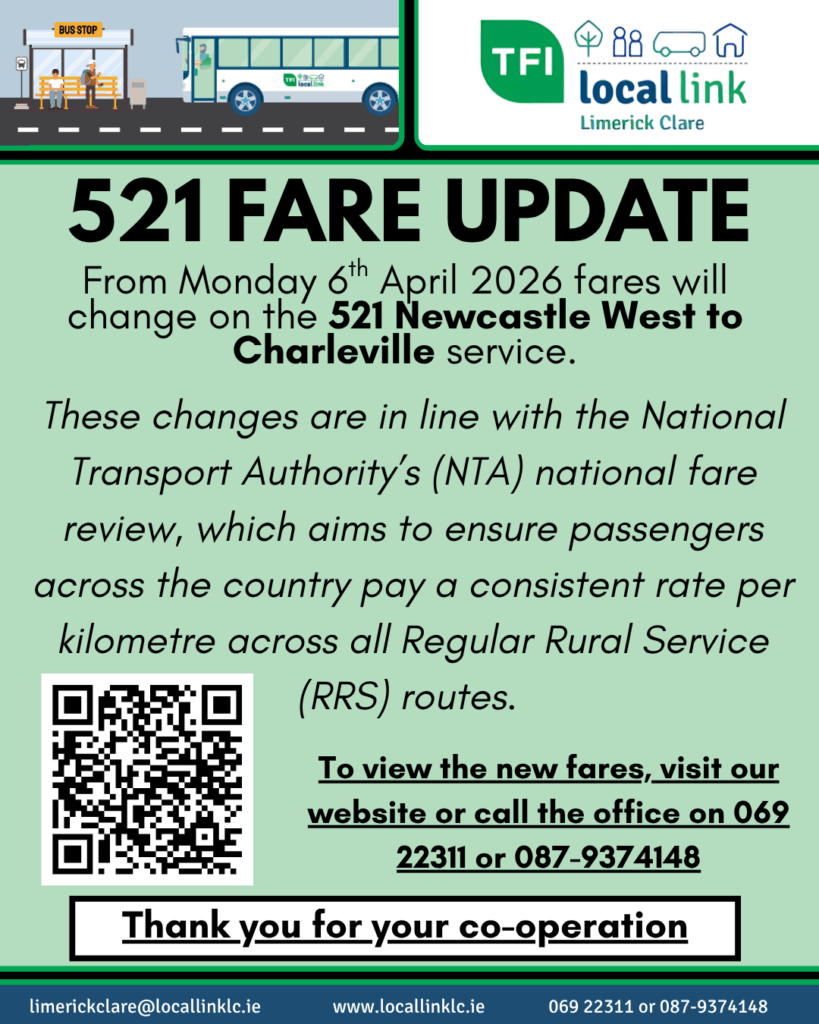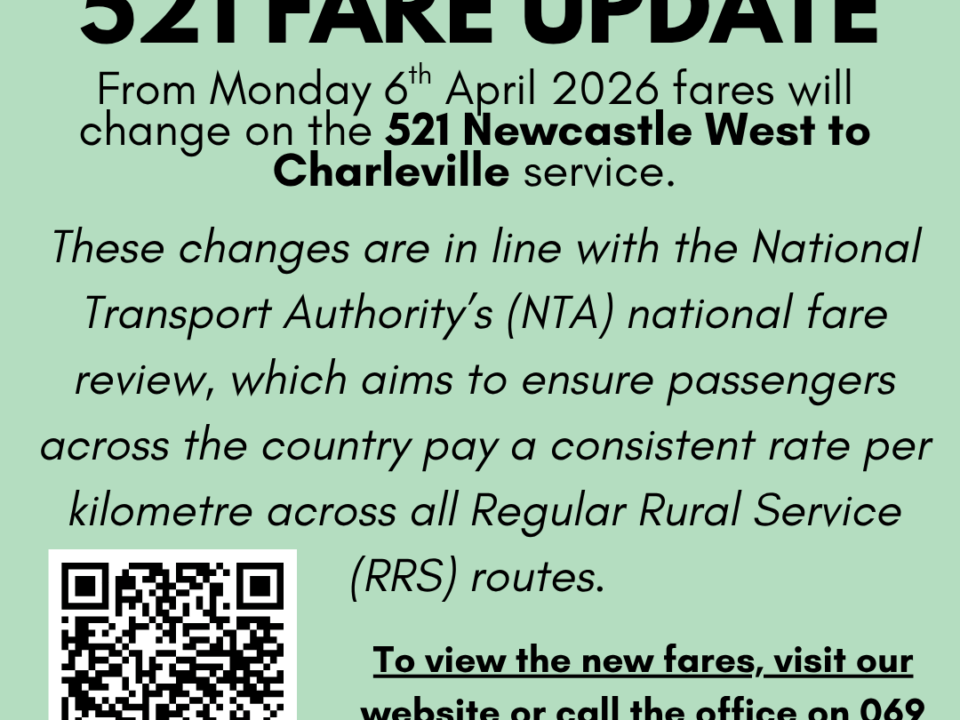 From Monday 6th April, fares will change on 521 Newcastle West to Charleville and 521 Charleville to Newcastle West routes. These changes follow the National Transport […]